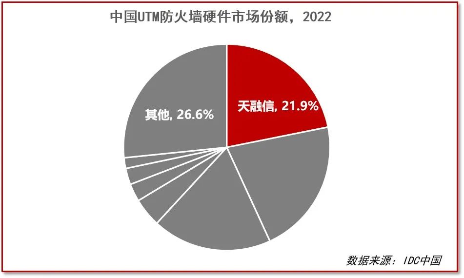 近日,国际权威机构IDC正式发布《2022年第四季度中国IT安全硬件市场跟踪报告》,2022年天融信防火墙产品以21.9%的市场份额再居榜首。至此,天融信防火墙已连续23年市场排名第一,同时VPN等产品市场份额同样名列前茅,彰显了中国网络安全硬件市场领导者地位。