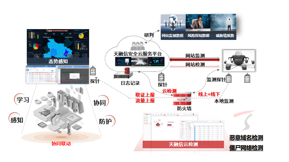 与此同时,天融信通过联动机制获取APT、IDS、DLP、WAF、EDR、态势感知、云端检测等安全组件的检测结果,从网络安全、数据安全、Web安全、漏洞检测、态势感知等维度协同防护;通过共享资产信息、漏洞信息、威胁信息、安全检测结果,获得各类安全产品更加强大的检测能力,感知整网安全风险点,实现动态安全监控和处置。天融信以专业的技术和优质的服务为客户提供覆盖端点、网络和服务的全域协同防护安全解决方案,实现多元协同的动态防御。