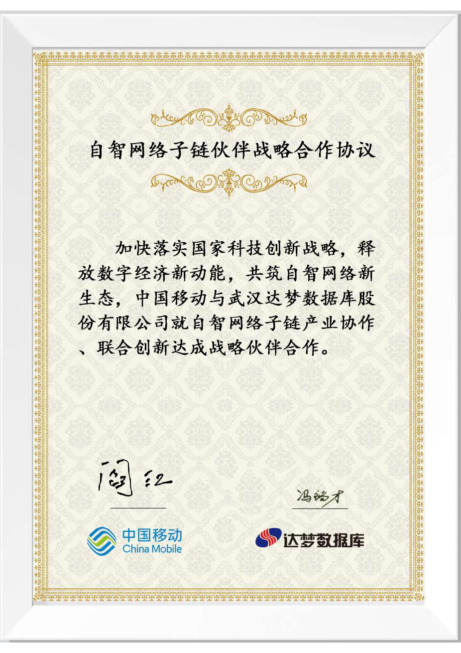 3月24日,由中国移动网络事业部主办,以“打造自智网络产业链,共筑数智运维新生态”为主题的「自智网络子链合作伙伴论坛」在京召开。武汉达梦数据库股份有限公司作国产数据库代表厂商之一,受邀参会并与中国移动正式签署「自智网络子链伙伴战略合作协议」,同时作为主要成员单位参与其“国产数据库适配迁移以及运维能力提升”数据库的攻关课题研究。