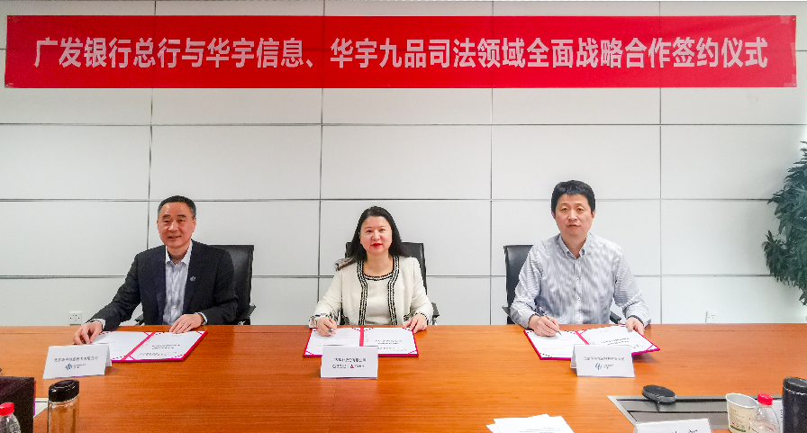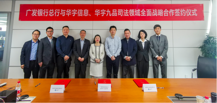 2023年4月3日,广发银行股份有限公司与北京华宇信息技术有限公司及北京华宇九品科技有限公司举行了司法领域全面战略合作签约仪式,三方将紧密结合各自业务优势及产品技术能力,面向全国司法领域,开展技术研究及产品合作,共同建设全面覆盖、移动互联、跨界融合、安全可控的智慧司法产品,实现三方共赢共生。
