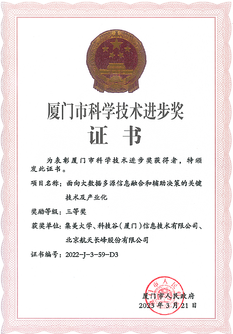 近日,2022年度厦门市科学技术奖获奖名单在厦门市科技创新大会上揭晓,航天长峰参与的“面向大数据多源信息融合和辅助决策的关键技术及产业化”项目荣获厦门市科学技术进步奖三等奖。