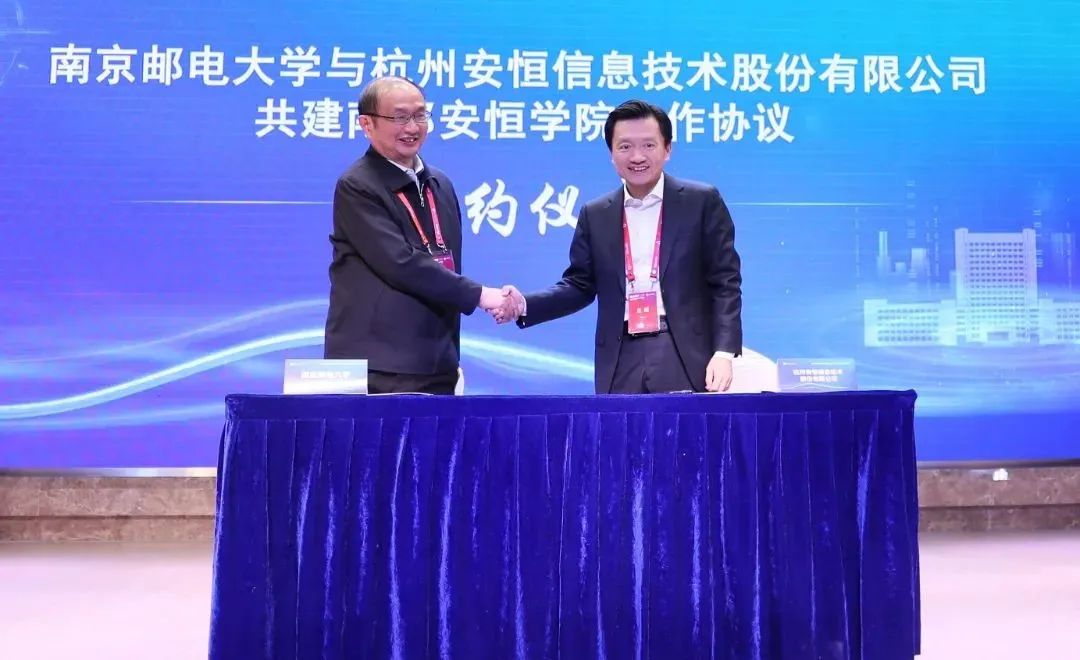 会上,范渊和南京邮电大学副校长王友国签订共建南邮安恒学院协议。双方通过共建“南邮安恒学院”,以实施“融通培养”和“精英培养”的培养模式,构建多层次教育人才培养体系,打造数字产业融合发展品牌,进一步提升学校人才培养质量、教学科研实力和学科建设成效,为加快建设网络强国、数字中国作出贡献。