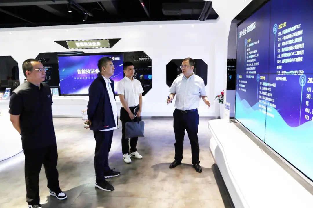 王斌局长一行参观了巨龙信息展厅,听取刘晹汇报公司智慧公安、数字政府、智能执法、海外政企的业务发展和取得成绩。