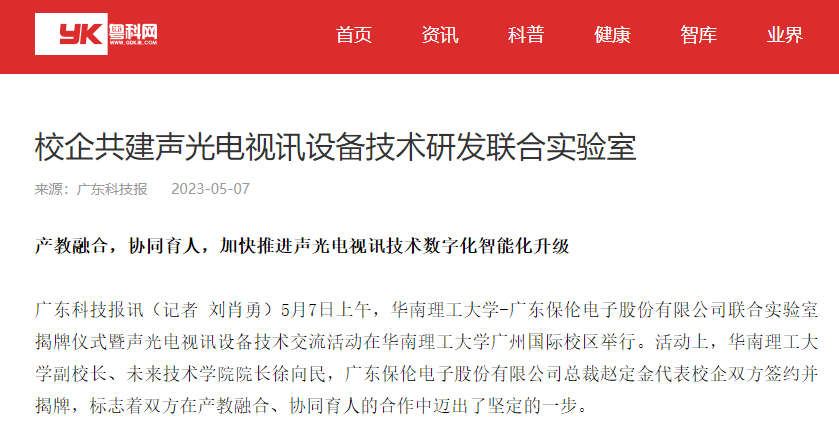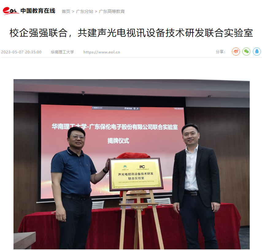为进一步拓展校企合作的深度和广度,5月7日上午,广东保伦电子股份有限公司(itc)与华南理工大学未来技术学院共建的声光电视讯数智产品联合实验室签约暨揭牌仪式在华南理工大学广州国际校区顺利举办。本次合作签约意义重大,标志着校企双方在产教融合、协同育人的合作中迈出了坚定的一步,着眼于打通从实验室到产业化的“最后一公里”,引领行业高质量发展。