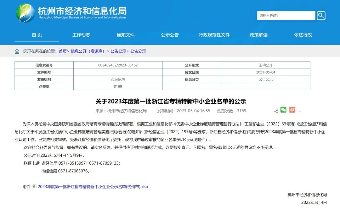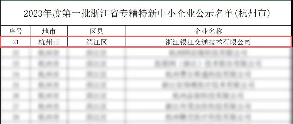 近日,杭州市经济和信息化局发布2023年度第一批浙江省专精特新中小企业名单(杭州市),浙江银江交通技术有限公司(银江技术全资子公司)凭借创新能力、研发实力与专业水平,荣获2023年度第一批浙江省“专精特新”中小企业认定!