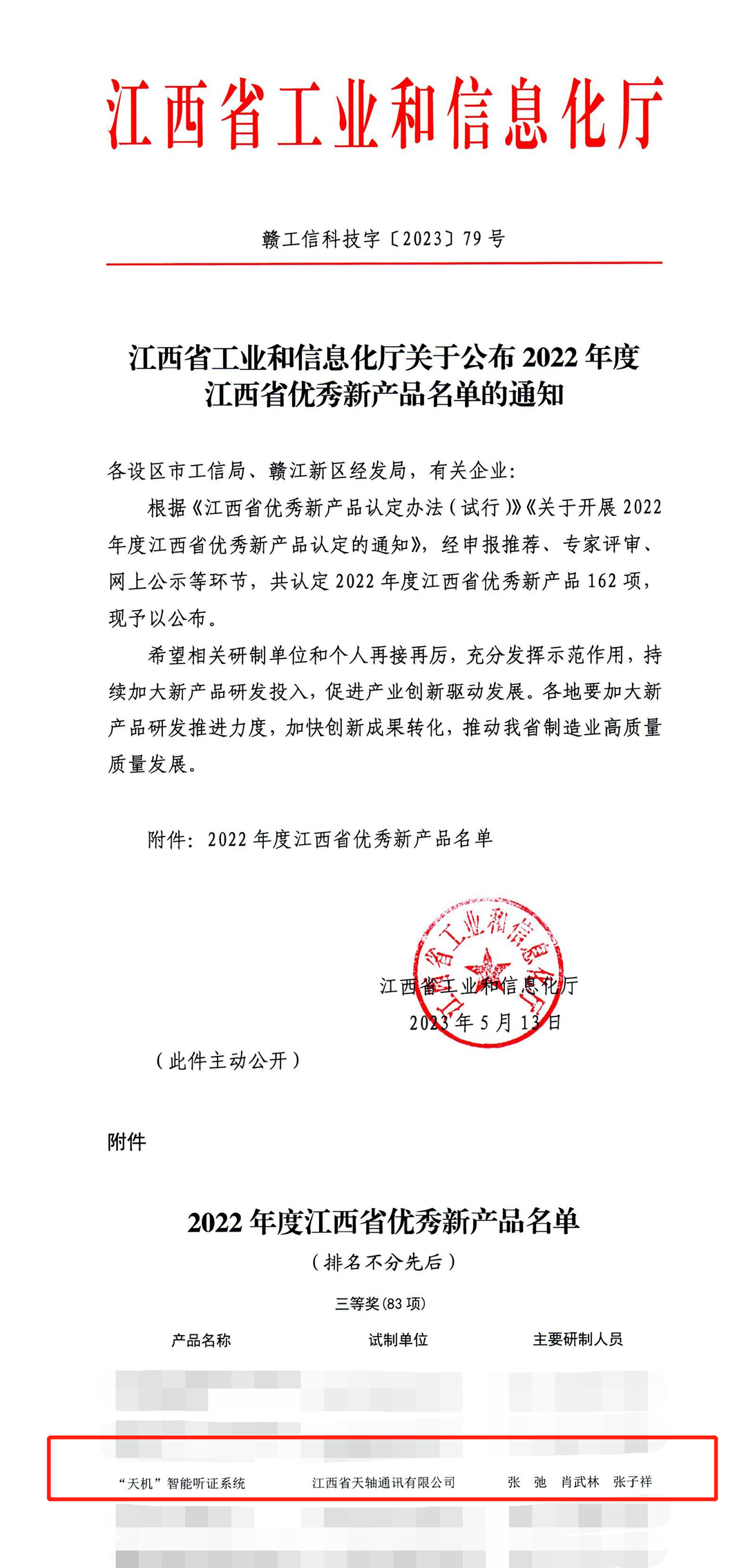 近日,江西省工业和信息化厅发布《关于公布2022年度江西省优秀新产品名单的通知》,对认定的2022年度江西省优秀新产品予以公布。公司王牌产品——“天机”智能听证系统成功上榜,获江西省优秀新产品三等奖。这是公司产品首次获评省级优秀新产品。
