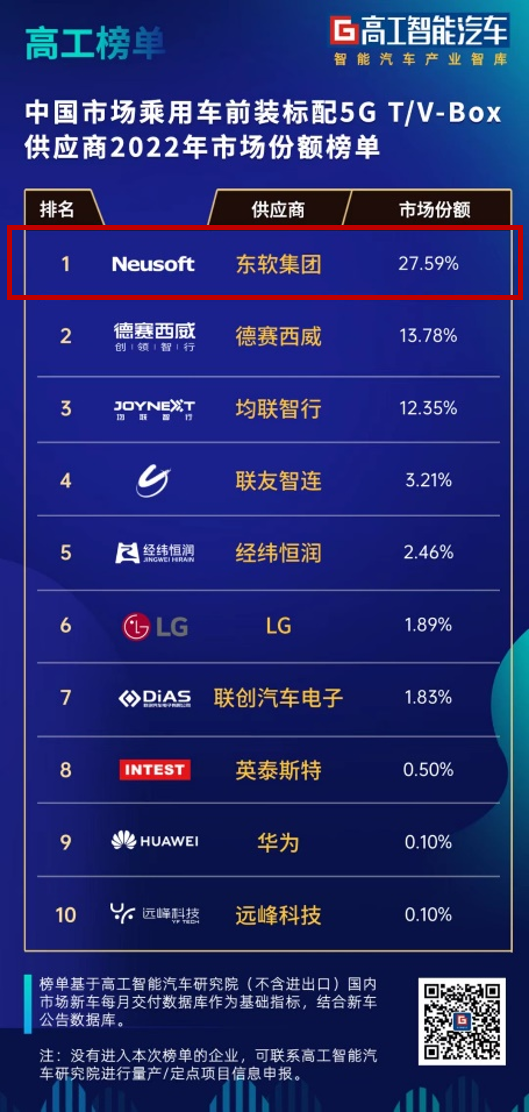 高工智能汽车指出,作为中国第一个通过工信部认证的5G T-Box供应商,东软同时也提供了中国第一个全套自主产权的C-V2X整个协议栈和产品解决方案。2021年以来,东软5G/V2X BOX产品率先陆续在长城、红旗、吉利等多款战略车型上量产上市,并且迅速打开国内外市场,陆续获得多家知名汽车厂商几十个中高端车型的产品订单。