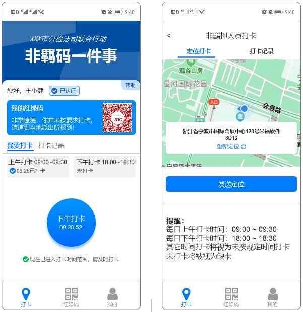 非羁押人员端通过强制安装监管APP,实现对非羁押人员的自动位置跟踪、人工刷脸核验,对不按时打卡、电子围栏越界等违规记录进行红绿码打分、告警;