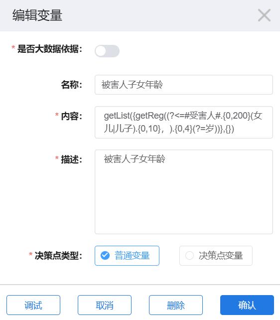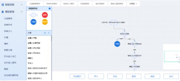 通过构建逻辑判定树的方式,针对个案模型、应用场景,以模型表达式的形式,将检察官的日常办案经验快速抽象成业务分析模型。模型表达式类似编程语言,可以设置特征变量、执行顺序、分支判断、列表循环、全文检索、正则匹配、NLP分类匹配、大数据比对接口等多种逻辑机能。