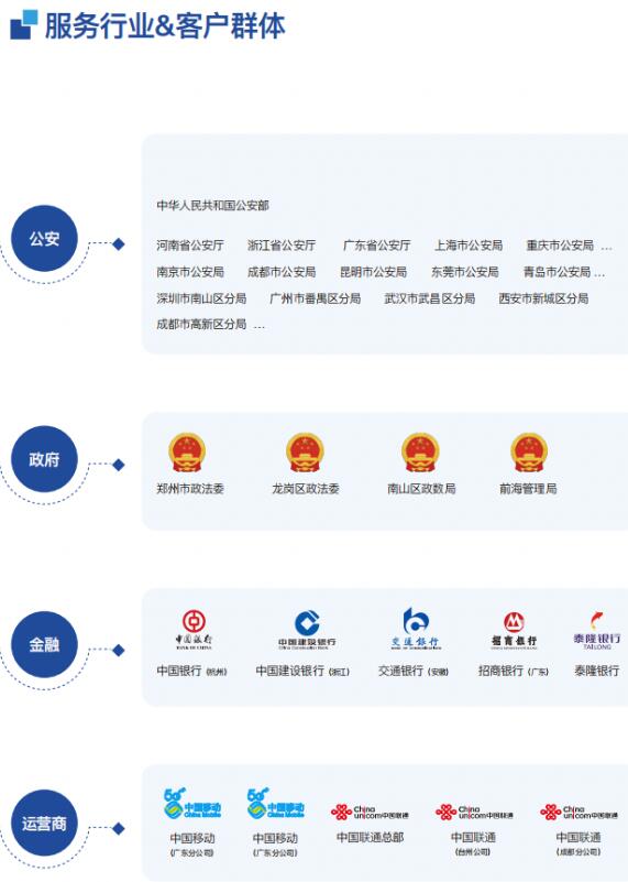目前,安巽产品和服务已覆盖全国90%省份,辐射全国上千个区县,为近4亿居民提供安全保护。同时,公司已与多家监管单位、政府机构、银行、公安大学以及知名互联网厂商建立合作,为其提供高质量服务,共同构筑安全网络空间。