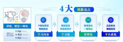 平台采用大数据分析技术进行数据挖掘和深度学习,结合矫正对象的个性特点和需求,对矫正课程进行智能配档和智能推送,并持续追踪矫正对象的学习轨迹,及时自动调整学习形式和学习内容,搭建人机互动的沉浸式矫正模式,在提高矫正效果的同时,通过智能化、数字化智慧矫正结果一键输出,最大限度解放人力,节省物力、财力。平台目前上线的有四类课程:必修课程、公共课程、狱本课程、自选课程。