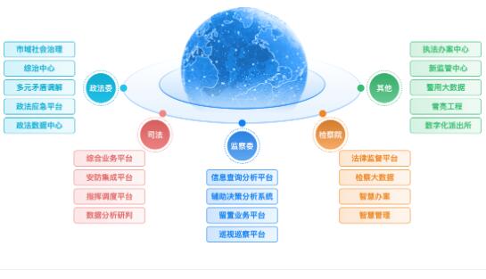 某省政法信息化项目建设以政法委为核心点,分别向上连接中央政法委,向下连接市政法委、综治办等四级纵向网络。利用大数据技术实现政法数据的深度挖局与分析,为领导决策提供有力的数据支撑,不断提升政法系统信息化建设水平和应用效能。