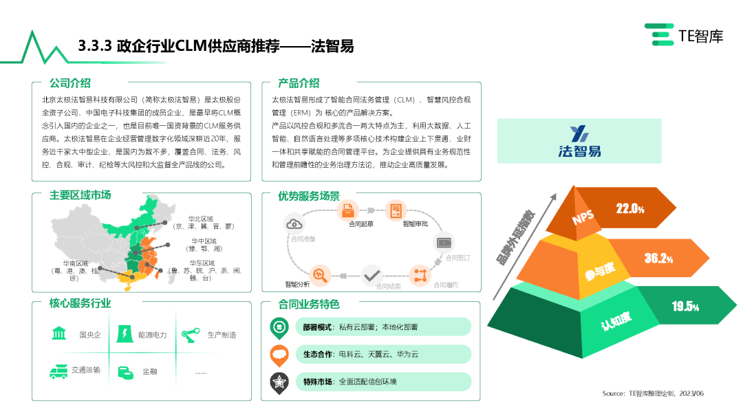太极法智易做为中国CLM行业的领导者也是最早将国际CLM管理理念和信息系统构架引入中国的信息化服务商,凭借20余年CLM(合同全生命周期管理)领域咨询和实施服务经验在国央企市场优秀实践中脱颖而出,保持政企CLM应用实践领导者。