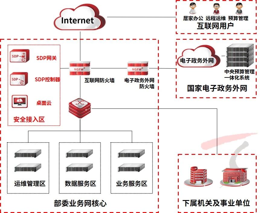 基于日常工作需要,该部委及其下属单位均需开通电子政务外网接入服务,实现与部委业务网逻辑隔离的中央预算管理一体化系统的访问。此外按照国家电子政务外网网络安全管理有关规范要求,为积极应对可能出现的远程办公、远程安全监测、远程运维保障的工作需要,急需构建一套安全可靠的互联网外部接入系统。