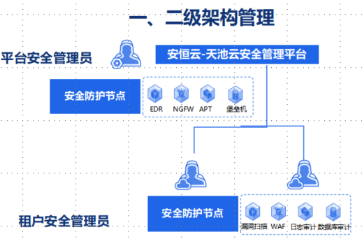 天翼云科技有限公司云南分公司“一城一池”云安全能力建设项目在天翼云平台侧部署了一套云安全管理平台和安全资源池,为云平台侧提供终端安全、运维审计、漏洞扫描、日志审计、数据库审计等安全能力;在租户侧亦部署了一套云安全管理平台和安全资源池,为租户侧提供VPN、数据库审计、防火墙、Web应用防护、主机安全、日志审计、运维审计、APT威胁监测等安全能力。云平台和租户可自助开通30余种SaaS化云安全能力,实现安全能力服务化。同时,平台侧的云安全管理平台作为一级管理平台,纳管位于租户侧的二级云安全管理平台。租户可自主维护安全资源池的安全能力,或者将安全资源池的安全能力托管给天翼云公司。