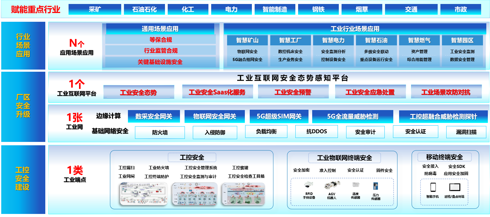 同时,基于网络安全禀赋优势,启明星辰打造面向工业互联网“N+1+1+1”能力体系,覆盖“云、网、边、端”四层架构的安全体系,安全解决方案适用智能制造、冶金、矿山、电力、石油化工等工业行业场景,支持公司级、集团级多种规模的安全运营,赋能多个重点行业,可有效保障智慧城市网络安全。