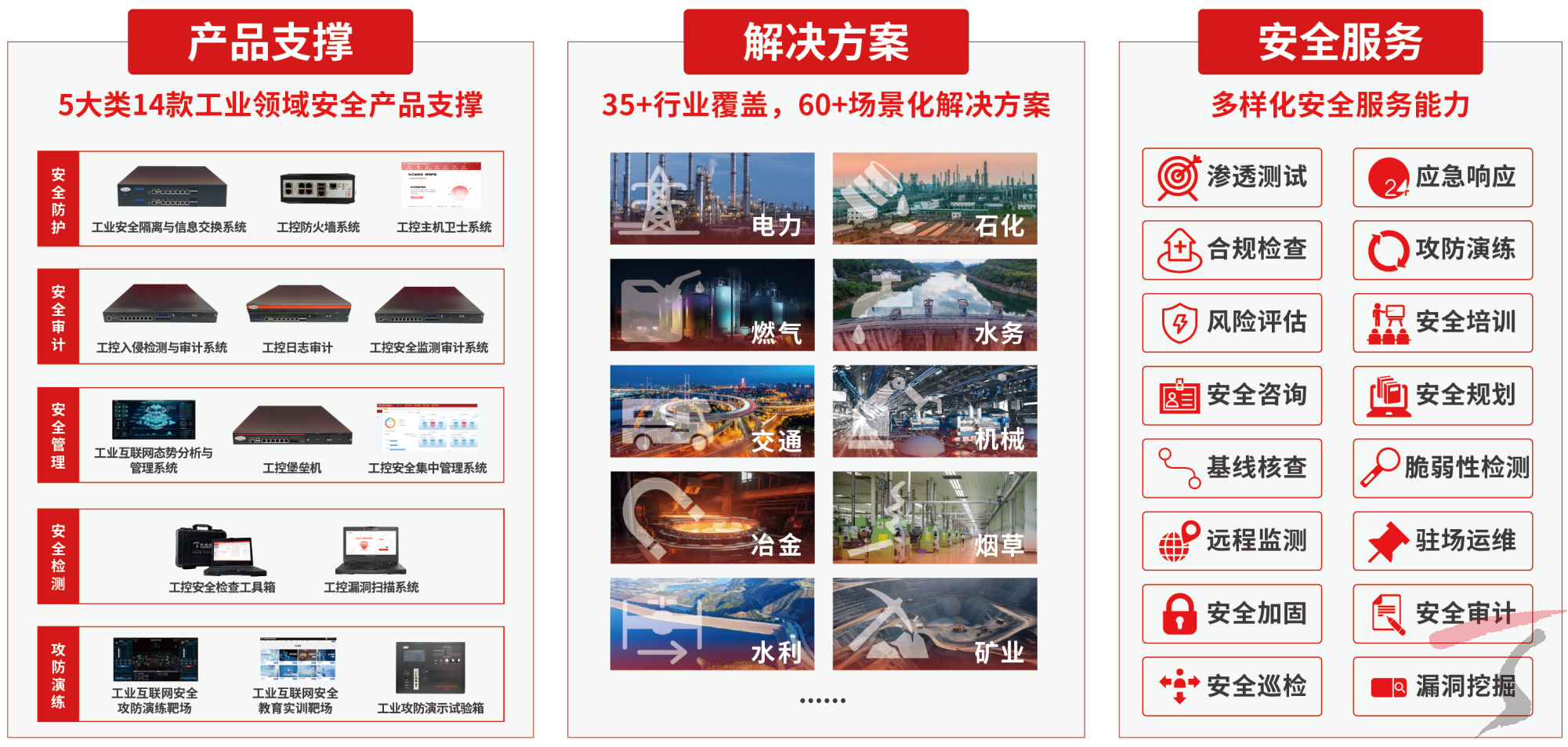 天融信基于多年的工业互联网业务场景研究经验,提出“以行为分析为基础,白名单技术为核心判断依据,黑名单技术为辅助验证手段”的核心理念,打造出安全防护、安全审计、安全检测、安全管理以及攻防演练等在内的五大类、十四款工业领域安全产品,并实现全类别产品国产化。天融信紧跟国家网络安全国产化建设步伐,满足等保2.0及关键信息基础设施安全保护条例要求,为筑牢我国工业互联网安全基座提供专业可靠的技术支撑。