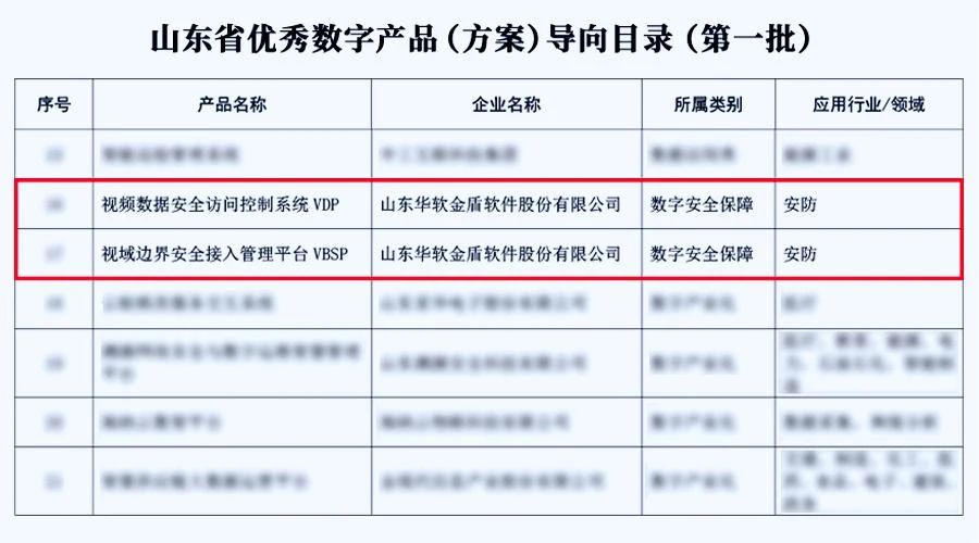 8月31日,山东省优秀数字产品(方案)导向目录(第一批)发布,金盾软件核心产品视域边界安全接入管理平台VBSP、视频数据安全访问控制系统VDP实力上榜。