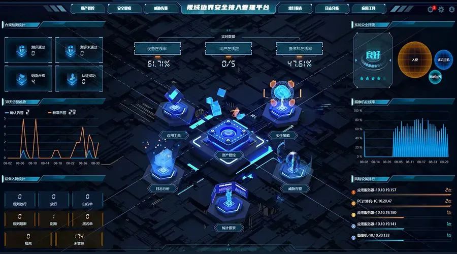 视域边界安全接入管理平台VBSP紧密贴合视频网边界管理需求,是集成资产探测、准入控制、终端安全管理、摄像机管理、监控告警及安全防护的一体化融合平台。单一平台即可满足视频网边界安全管理需求,可提供资产发现管理、设备准入控制、终端电脑安全防护、哑终端以及摄像机设备安全管理、终端数据管理功能,为视频网边界提供有力的安全防护。实现设备入网“看得见”,设备行为“管得住”,安全事件“可追溯”。