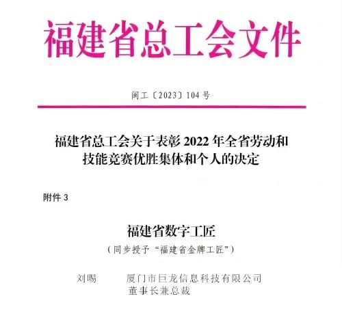 近日,福建省总工会发布《关于表彰2022年全省劳动和技能竞赛优胜集体和个人的决定》,巨龙信息董事长兼总裁刘晹荣获“福建省数字工匠”及“福建省金牌工匠”荣誉称号。