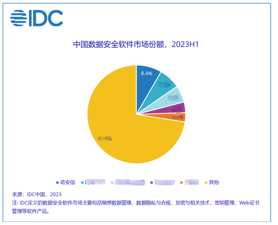 10月20日,IDC发布了《2023年上半年中国IT安全软件市场跟踪报告》(简称《报告》)。《报告》显示,2023年上半年中国IT安全软件市场规模为107.8亿元(约合15.6亿美元),同比上升7.8%。其中,奇安信在数据安全、终端安全、安全分析和情报三大子市场位居第一,市场份额分别为8.4%、18.3%和10.2%,是唯一一家占据三项头名的入围企业。