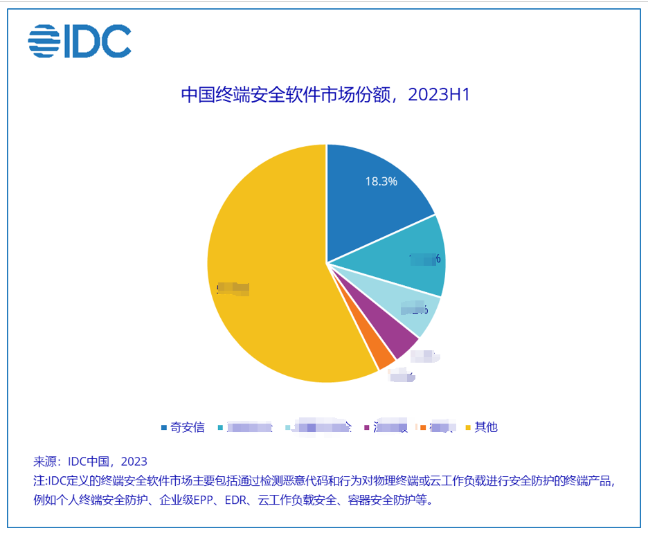 《报告》显示,2023年上半年,奇安信终端安全软件市场份额占比达到18.3%,与去年同期相比,上升3.8个百分点。值得关注的是,从2018年IDC推出该细分领域市场份额排名至今,领头羊位置从未旁落。