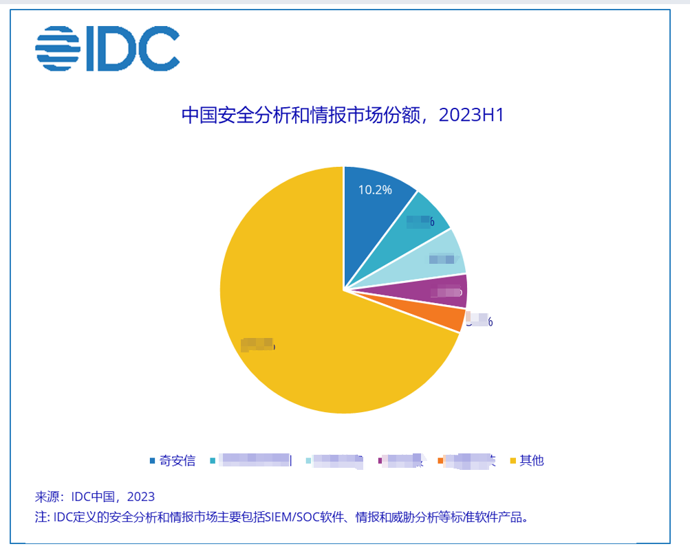在安全分析和情报领域,《报告》显示,奇安信以10.2%的市场份额排名第一,相较于去年同期市场份额上升1.7个百分点,自设置该细分领域以来,奇安信同样一直牢牢占据头名。