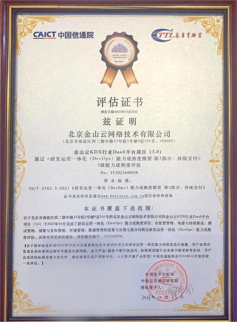 10月26日,在第二十一届 GOPS 全球运维大会2023上海站,金山云顺利通过中国信息通信研究院(以下简称“信通院”)《研发运营一体化( DevOps )能力成熟度模型第3部分:持续交付》三级能力成熟度评估,展现出公司DevOps相关能力已达国内先进水平。