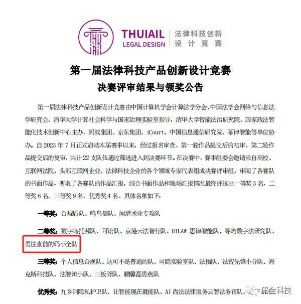 第一届法律科技产品创新设计竞赛是由清华大学教务处批准立项,中国计算机学会计算法学分会、中国法学会网络与信息法学研究会、清华大学计算社会科学与国家治理实验室指导,清华大学智能法治研究院(THUIAIL)、国家政法智能化技术创新中心主办,蚂蚁集团、京东集团、iCourt、中国信息通信研究院、幂律智能等单位协办的国家级竞赛。