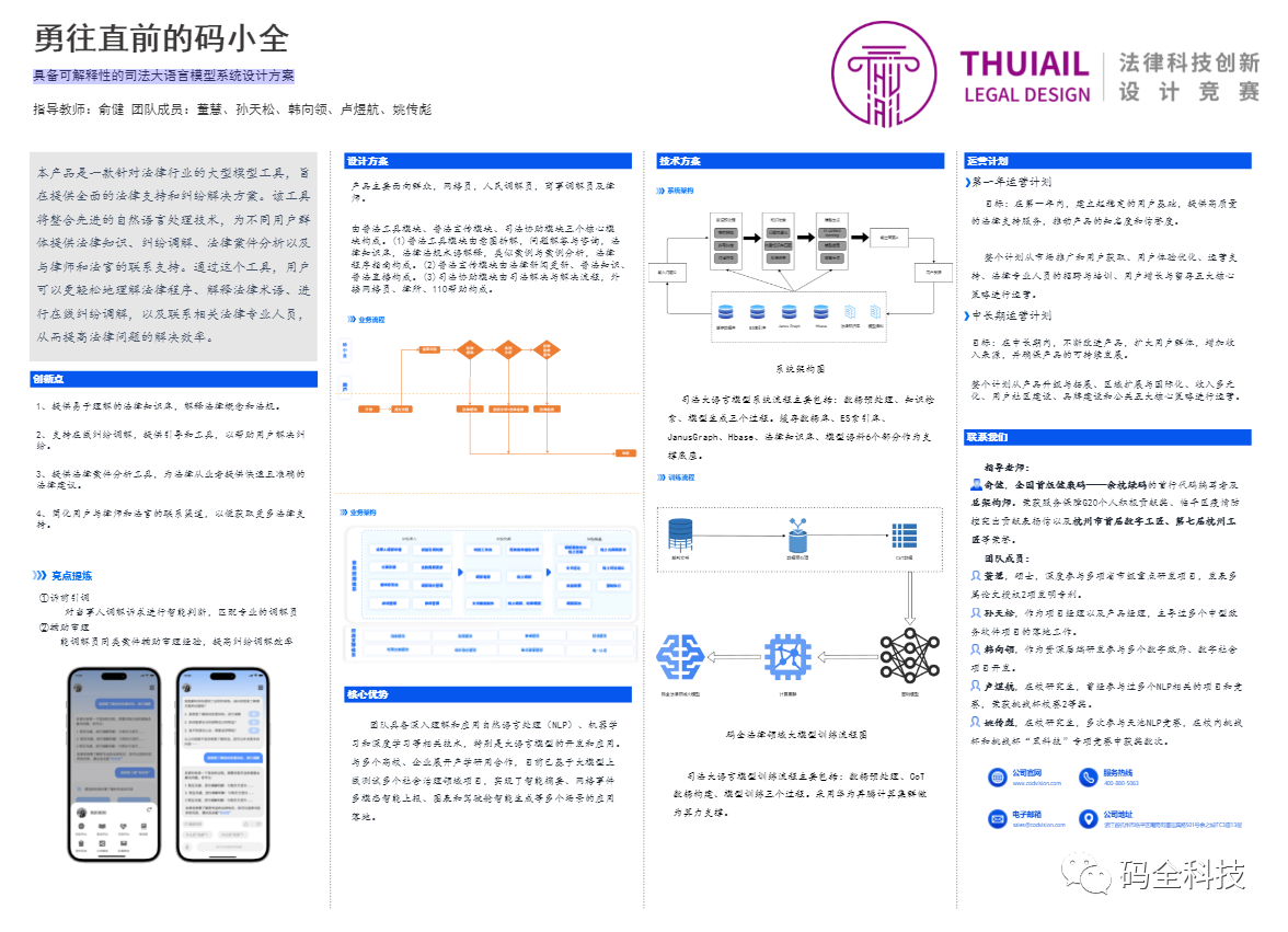 码全科技参赛团队“勇往直前的码小全队”是由研发总监俞健担任指导工作,团队成员为董慧、孙天松、韩向领、卢煜航、姚传彪,(谢振兴、洪丹、李冰涛、宗佳敏、陈炯辉对本次参赛亦有贡献),团队以《具备可解释性的司法大语言模型系统设计方案》作为参赛项目,在参加决赛的22个队伍中脱颖而出,斩获决赛二等奖。