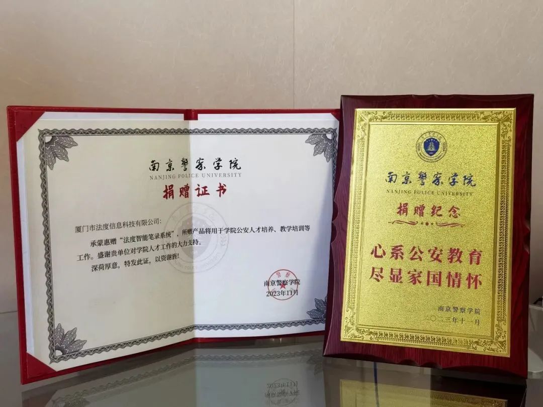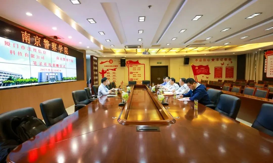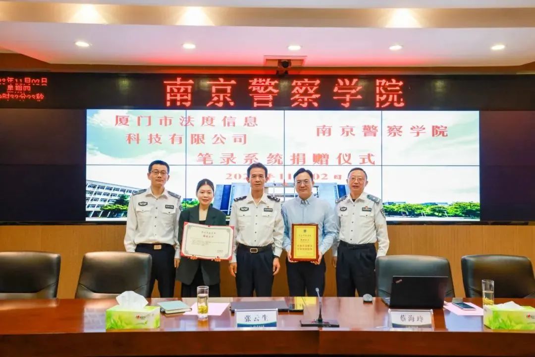 11月2日,南京警察学院举行厦门法度智能笔录捐赠仪式。仪式上,厦门市法度信息科技有限公司向南京警察学院的侦查学院捐赠法度智能笔录系统,用于日常教学和研究。南京警察学院叶卫副院长,南京警察学院侦查学院厉开平副院长、庆海涛教授、李涛副教授,法度信息科技有限公司张云生总经理等人参与捐赠仪式。