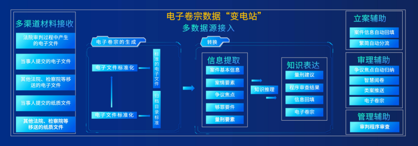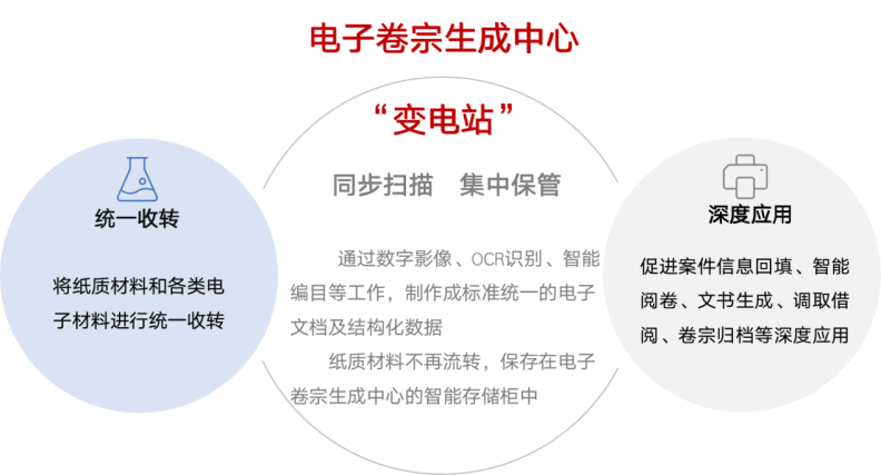 2020年6月,汉王影研电子卷宗生成管理中心在北京高院正式投入运行,成为了全市法院首家电子卷宗生成管理中心,针对中心功能和数据赋能情况,同时结合变电站“将电力系统中对各种电压和电流变换为可接受电能及分配电能”的概念,以卷宗生成为基础,围绕政法协同办案平台,以信息化手段为核心,对多源卷宗材料进行标准化集中处理,结合智能化系统,制作标准统一的电子文档及结构化数据,为推进各项深度应用功能奠定坚实基础,打造支持卷宗数据协同阅览、深度挖握、在线数据分析等多功能为一体的集约化数据生成中心数据“变电站”新模式。