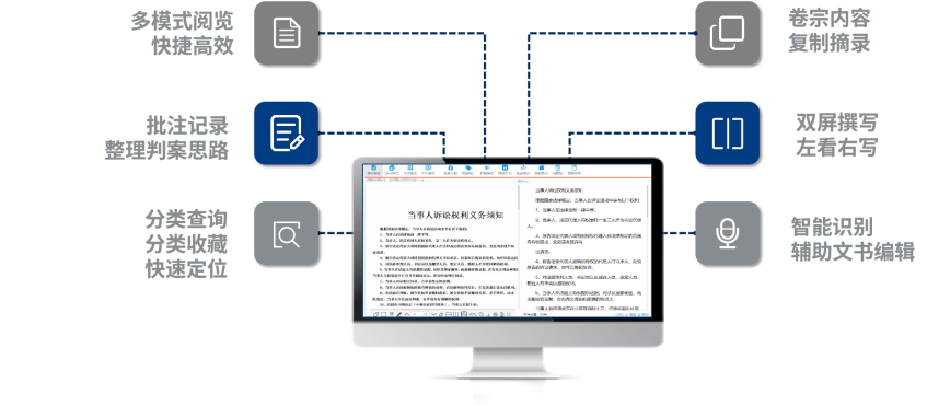 智慧阅卷:智慧阅卷系统遵循法官阅卷目录标准规范,基于汉王NLP自然语言分析、OCR文字识别等AI能力,构建智能语义搜索引擎,实现集检索、定位一体化的强大功能。提供多种文件格式卷宗材料在线浏览,法官在办案过程中可便捷查询卷宗,可实现多种阅卷目录自由切换,一键切换多种阅卷视图,实现电子卷宗“左看右写”。卷宗文本复用、阅卷多类型批注、多屏材料比对阅卷、阅卷笔记记录等功能,使法官阅卷、庭审更加便捷,大幅提升法官办案效率。
