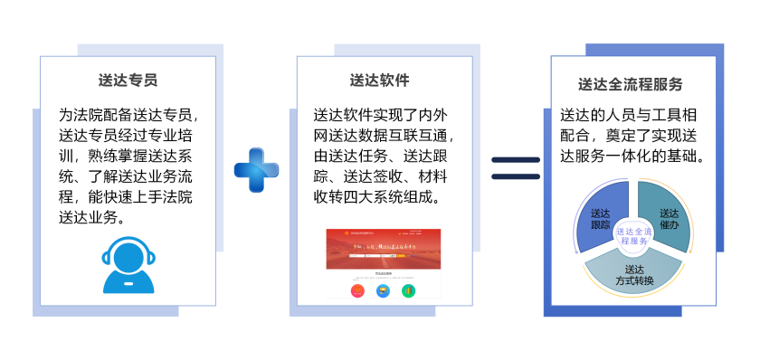 集约送达:利用信息化手段,结合法院整体送达业务流程,采用“技术+服务”的方式,通过一站式送达综合管理平台的搭建,配合各业务流程节点所属专项人员服务,实现整个送达周期集中管理与高效送达,切实保障送达工作效率。