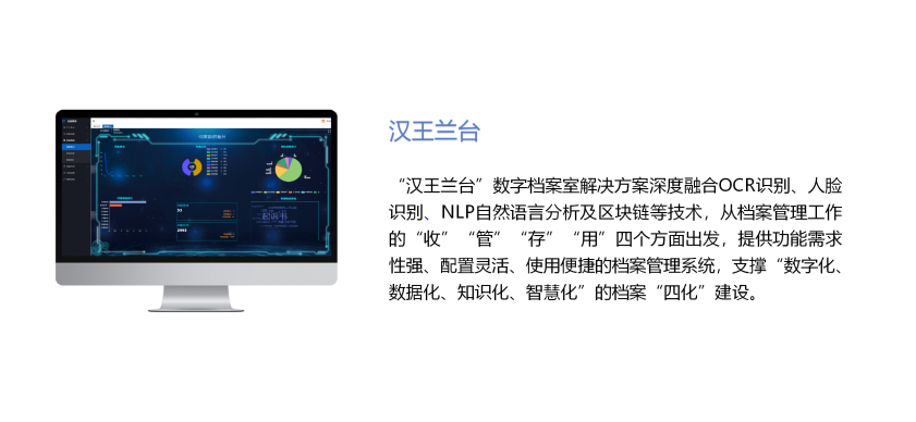 智慧档案:“汉王兰台”数字档案室解决方案深度融合OCR识别、人脸识别、NLP自然语言分析及区块链等技术,从档案管理工作的“收”“管”“存”“用”四个方面出发,提供功能需求性强、配置灵活、使用便捷的档案管理系统,支撑“数字化、数据化、知识化、智慧化”的档案“四化”建设。