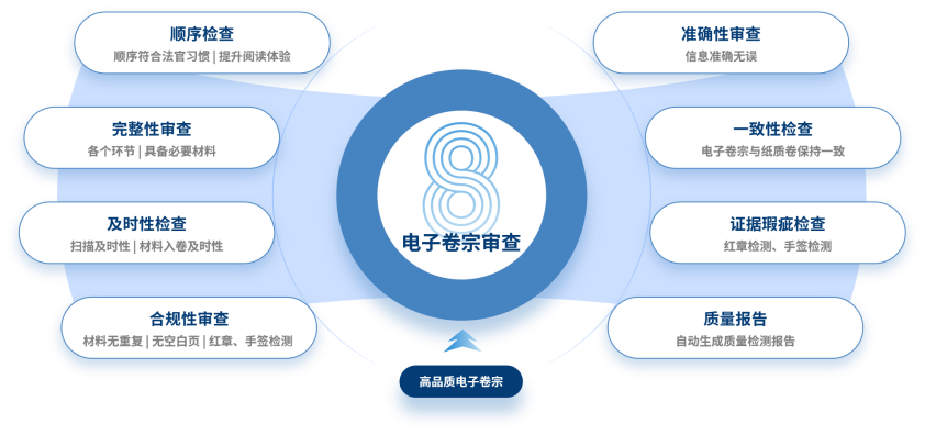 电子卷宗归档智能检查:档案智能检查通过图像识别、OCR 文本识别、语义分析等人工智能技术,灵活匹配规则,自动实时对归档环节的电子卷宗进行检查。归档检查工作全流程智能化、自动化,消除了人为错误,省去了手动检查的麻烦,简化归档流程、释放劳动力、提高档案归档效率,方便当事人、律师和其他工作人员查询和利用档案,提高司法透明度和公信力同时也为电子归档规范化、智能化管理提供保障。