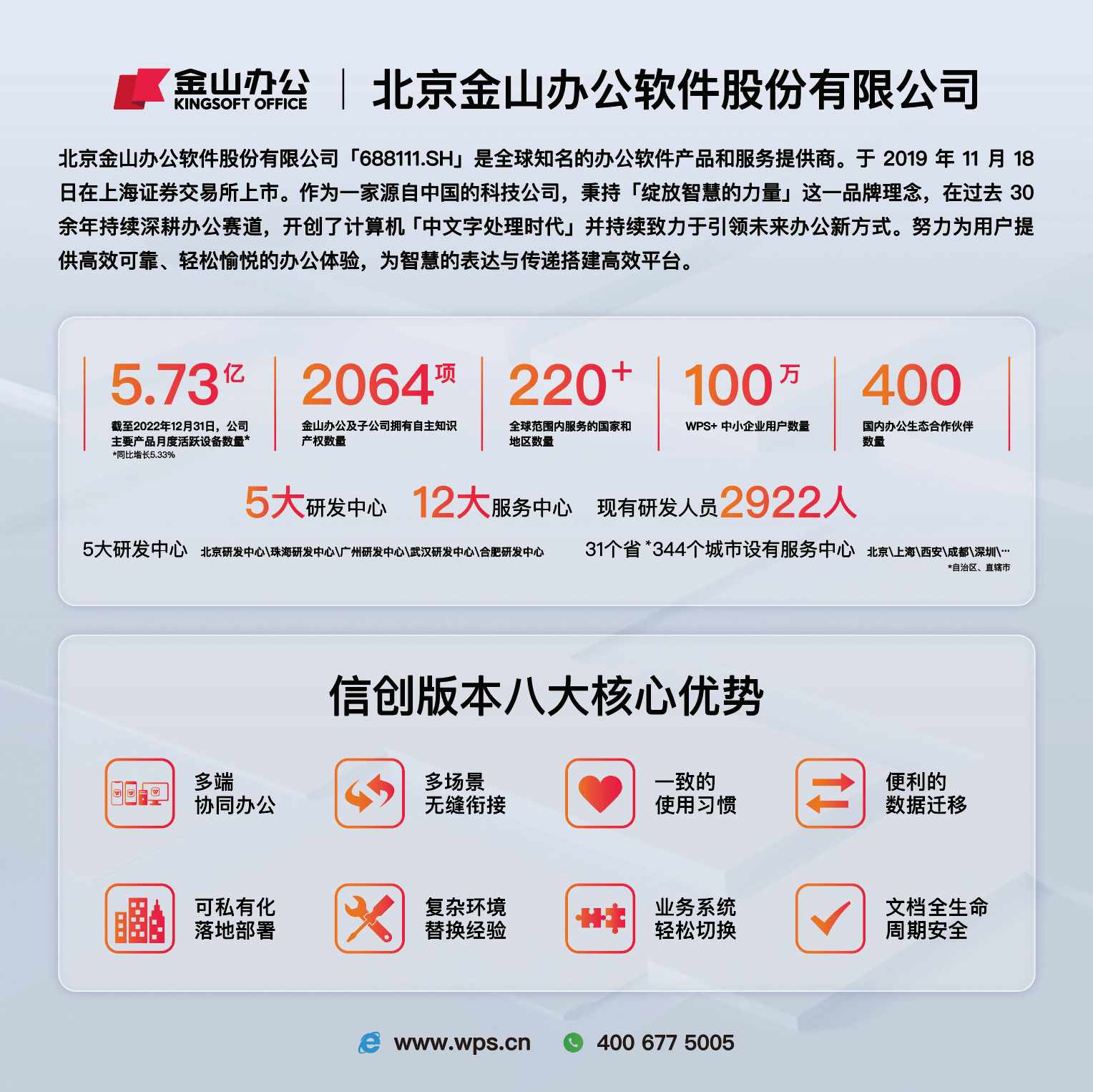 北京金山办公软件股份有限公司(以下简称“金山办公”),成立于1988年。专注于Office办公文档处理领域技术与产品研究、开发、营销及服务,是全球领先的办公软件和服务提供商,旗下著名产品包括:包括 WPS Office 、数科OFD,文档中台,金山文档等办公能力产品矩阵以及一站式数字办公平台解决方案WPS 365。金山办公拥有办公软件领域 30 余年研发经验及技术积累,旗下主要产品及服务皆由金山办公自主研发,对核心技术具有自主知识产权。金山办公重点针对文字排版技术、电子表格计算技术、动画渲染技术、在线协同编辑、安全文档以及数据协同共享等多种关键技术进行深入研究,公司产品可完美支持 Windows、Linux、Mac OS、Android、iOS、HarmonyOS 等众多主流操作平台上应用通过核心技术的突破,打造了云和协作办公应用服务体系,创建智能办公新模式,全面提升用户体验。公司产品及服务目前已覆盖30多个省市自治区政府、400多个市县级政府,市场占有率达到90%以上。随着信息化建设步伐的加快,越来越多的客户乐享 WPS及其系列产品所带来的办公新体验。