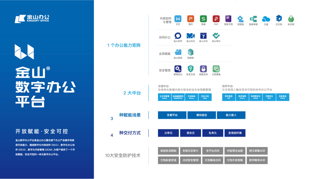 金山数字办公平台的核心价值在于开放赋能、安全可靠,其包含文档中台和协作中台两大赋能平台。该平台通过模块化的文档能力和即时通讯能力,以用户自有平台为核心,帮助客户打造独立的数字办公平台,进一步激发组织办公活力。