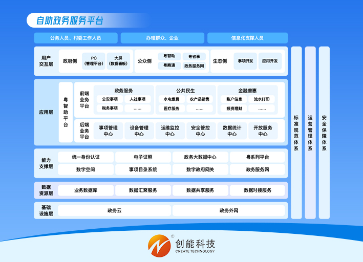 广东创能科技股份有限公司成立于2000年,经过二十多年的发展,逐步成为聚焦数字政府、智慧城市和系统集成领域的高新技术企业。公司致力于将数字技术广泛应用于政府和企业管理服务,以提升客户价值为导向,坚持创新驱动发展,积极参与国家乡村振兴建设,助力基层不断提高公共服务水平。“为大众提供安全、舒适、便捷的生活”的企业使命是创能人的共同追求,我们期待与您携手,紧跟网络强国和数字中国的宏伟战略,同心共创智慧明天!