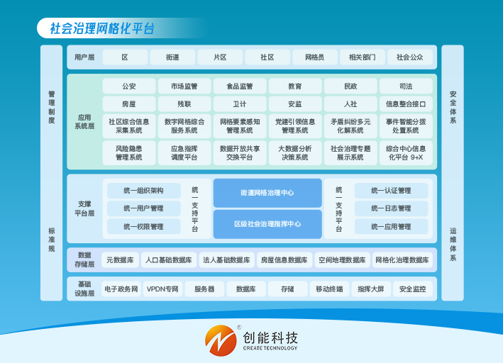 以基础网格为抓手,纵向贯通省、市、区(县)、街(镇)、社区(村委)、网格六级全覆盖,横向整合数十个业务部门,打破信息数据孤岛,创新互联互通机制,以“大网格、大融合、大巡查、大智慧、大参与、大诚信”的创新工作理念,构建全域统一的智慧网格社会治理行业解决方案。