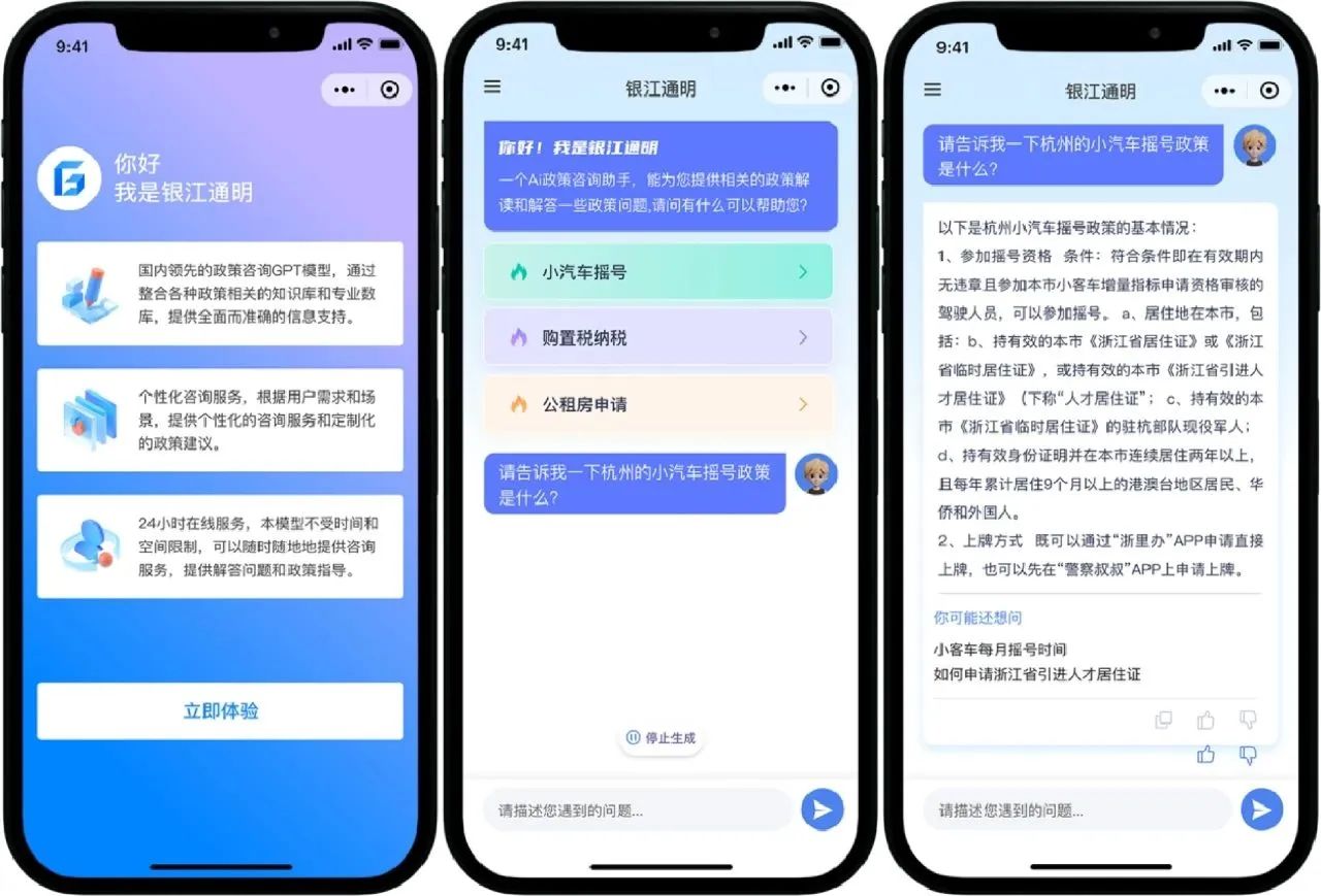 在政策咨询方面,“银江通明政务”赋智民生问事和企业咨询。针对个人生命周期和企业生命周期中的各种办事需求,“银江通明政务”行业模型快速解读海量政策,对政策进行画像和标签标识,通过多轮交互式问答,实现精准理解民众和企业咨询意图,确保信息的精确传达和问题的有效解决。