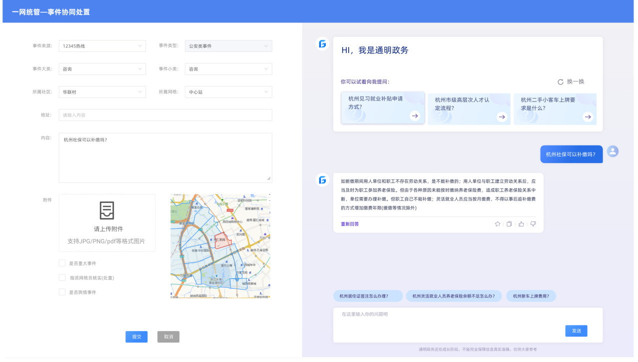 在一网统管方面,“银江通明政务”行业模型赋能“一网统管”传统业务,改变了传统的城市治理方式。“银江通明政务”基于城大脑数据服务能力,对市-区-街道-社区各层级全量数据接入,围绕社会治理领域高频高发事项,依靠自然语言处理、知识图谱等数智能力构建全息感知发现-自动分拨流转-辅助协同处置-监督反馈的全流程闭环城市运行治理体系,构建数字化、智能化、精细化的社会治理运行新形态,释放数字赋能效应。