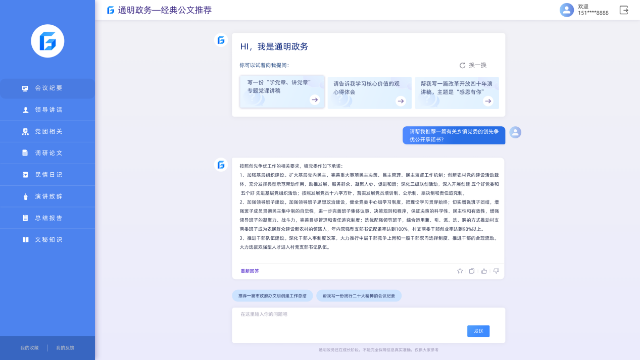 在经典公文推荐方面,“银江通明政务”可实现一句话获取公文模板。经典公文推荐利用自然语言处理(NLP)技术,通过与用户的交互式对话,智能识别写作标题和关键词,准确理解用户写作意图,精准推荐逻辑完整、行文标准的公文模板。对于日常有大量文书类工作要处理的用户而言,借助“银江通明政务”行业模型的能力,能够有效帮助用户快速获取相关资料,改善政务办公的流程机制,进而提高工作效率。