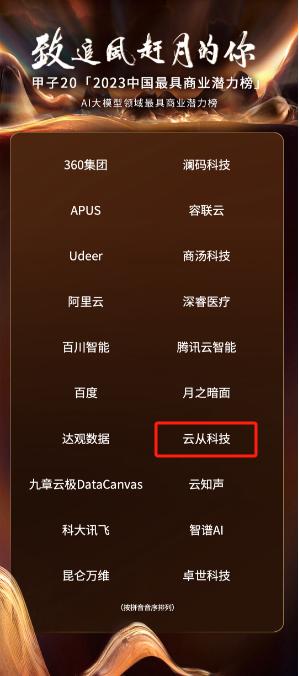 近日,由中国科技产业智库甲子光年举办的甲子引力年终盛典成功举办,大会公布了甲子20系列榜单,旨在表彰 2022-2023 年度在科技产业各细分赛道上拥有核心技术实力,并在商业化上颇有成效的优秀成长型科技公司,云从科技从容大模型凭借在语言、视觉、多模态大模型方面的技术突破与商业化进程入选AI大模型最具商业潜力榜单。