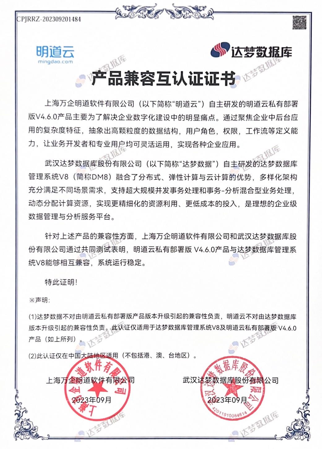 近日,武汉达梦数据库股份有限公司自主研发的达梦数据库管理系统V8(简称DM8)与上海万企明道软件有限公司(简称“明道云”)自主研发的明道云私有部署版V4.6.0产品完成了兼容认证测试。测试结果表明,双方产品相互兼容,系统运行稳定,可高效满足用户需求。此次合作是双方强强联合赋能行业数字化转型的一次创新实践,也是双方携手推动国产基础软硬件生态建设的积极探索。