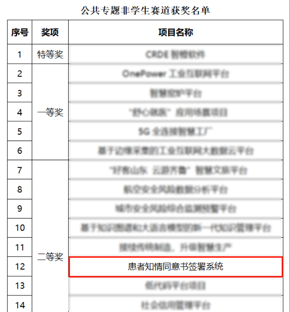 近日,在山东省工业和信息化厅、中共山东省委省直机关工作委员会、山东省总工会等单位联合主办,山东省计算中心、山东省数字经济协会等单位共同承办的第七届“鲲鹏杯”山东新动能·软件创新创业大赛中,同智伟业报送的“患者知情同意书签署系统”在三百余个参赛项目中脱颖而出,荣获公共专题组非学生赛道二等奖。