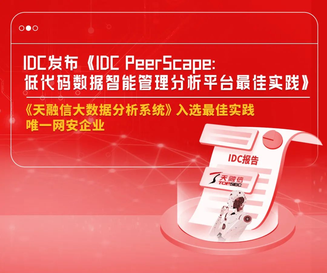 近日,国际权威咨询机构IDC正式发布《IDC PeerScape: 低代码数据智能管理分析平台最佳实践》报告。天融信大数据分析系统凭借强大的安全分析引擎和可视化拖拽式的模型构建能力入选最佳实践,成为唯一入选该报告的网安企业。