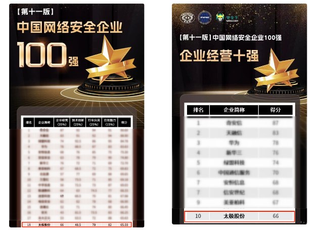 近日,国内权威网络安全媒体、第三方安全咨询机构安全牛正式发布第十一版《中国网络安全企业100强》。太极计算机股份有限公司(以下简称“太极股份”)凭借在数据安全领域领先的技术优势和优异的市场表现以及企业综合实力,再次入选中国网络安全企业100强,位列全国第18名,并同时入选“企业经营十强”。