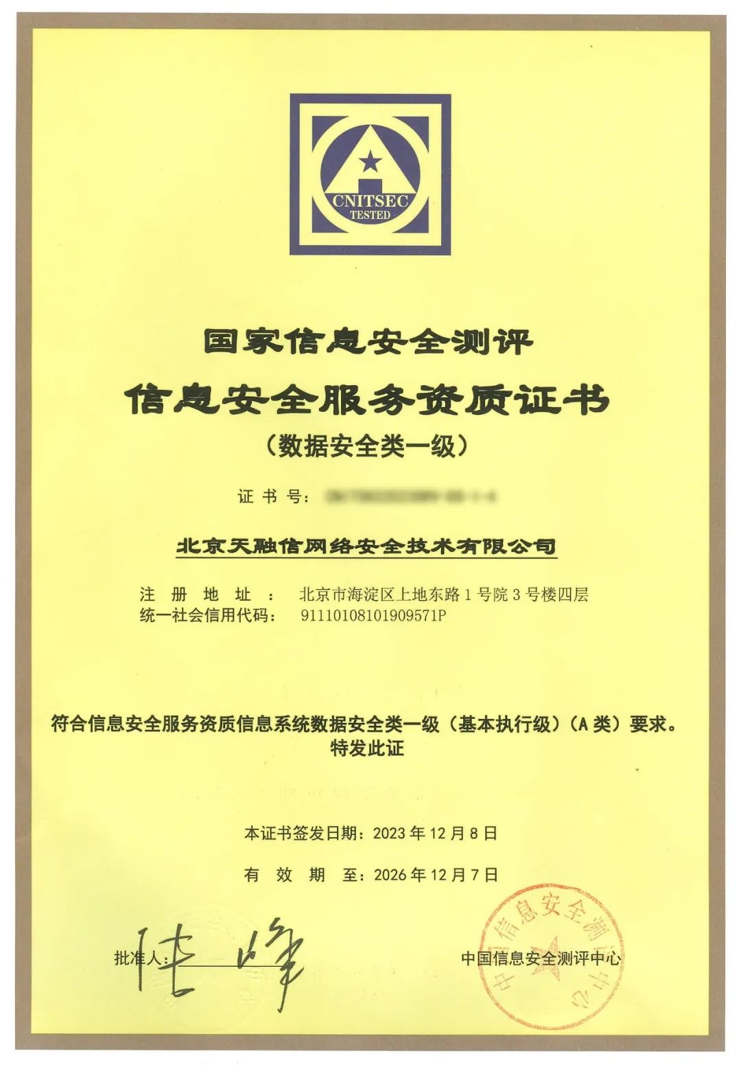 近日,中国信息安全测评中心公布了首批国家信息安全服务资质数据安全类一级获证企业名单,天融信成为首批获证企业。至此,天融信已获得国家信息安全服务资质数据安全类、云计算安全类、安全工程类、安全运营类、安全开发类、风险评估类等方向的最高级别服务资质资格,彰显天融信在数据安全、云安全、安全服务与运营、安全开发等方面强劲的综合实力!