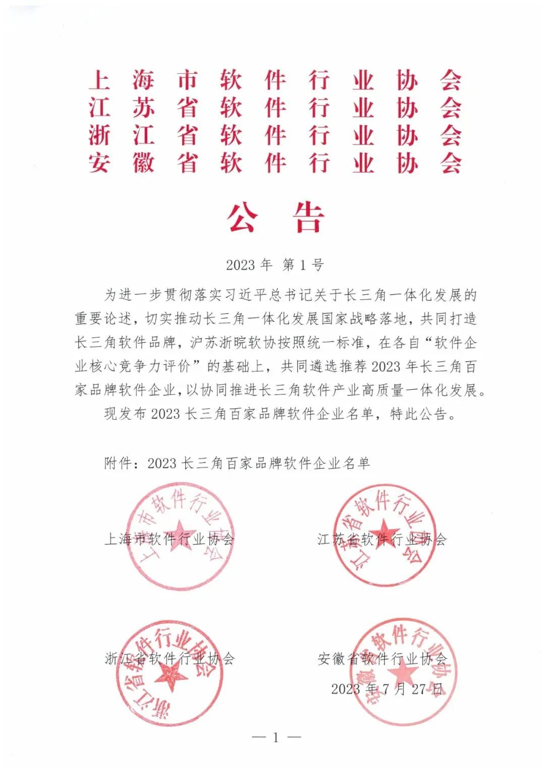 近日,由上海市软件行业协会、江苏省软件行业协会、浙江省软件行业协会、安徽省软件行业协会共同举办,为协同推动长三角软件产业高质量一体化发展,共同打造长三角软件品牌,沪苏浙皖协统一标准,在各自“软件企业核心竞争力评价”的基础上,经过共同遴选推荐,网进科技获“2023年长三角百家品牌软件企业”。